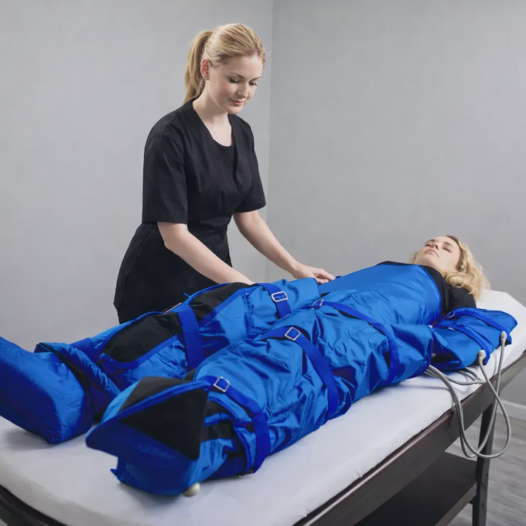 Pressotherapy is a computer controlled compression system, which operates using inflating pumps. The body suit is equipped with infra-red heating elements. The far-infrared can help increase basic metabolic rate (BMR), which is the fast and natural way to lose weight.